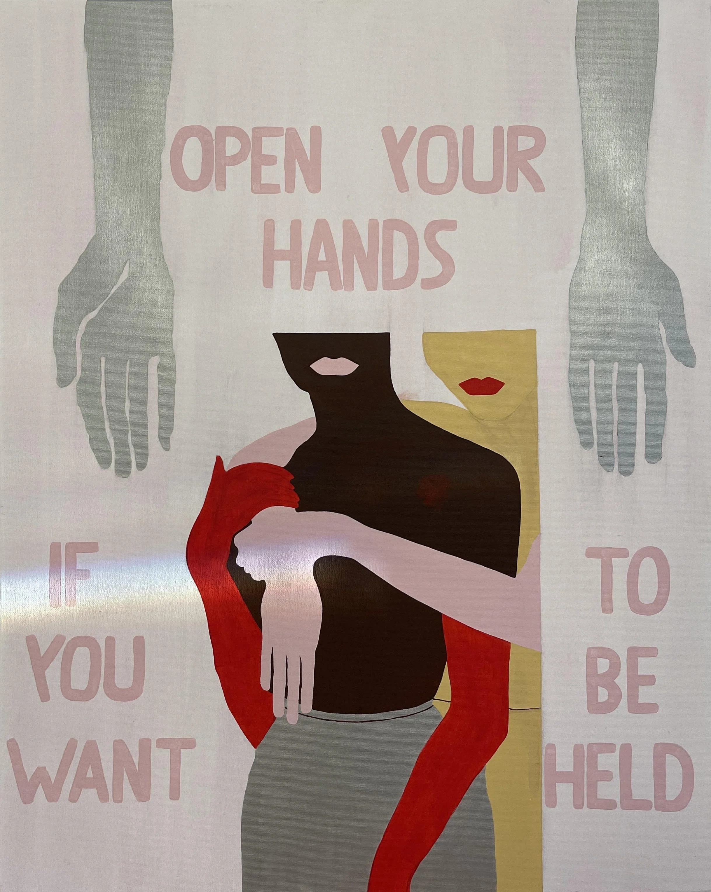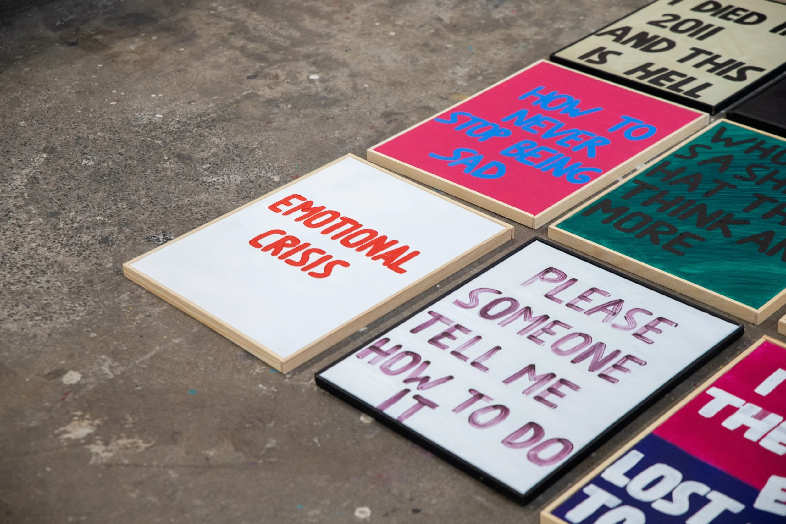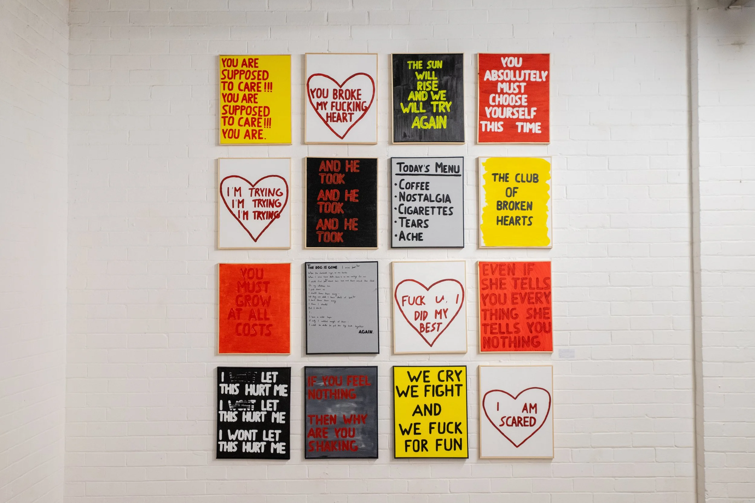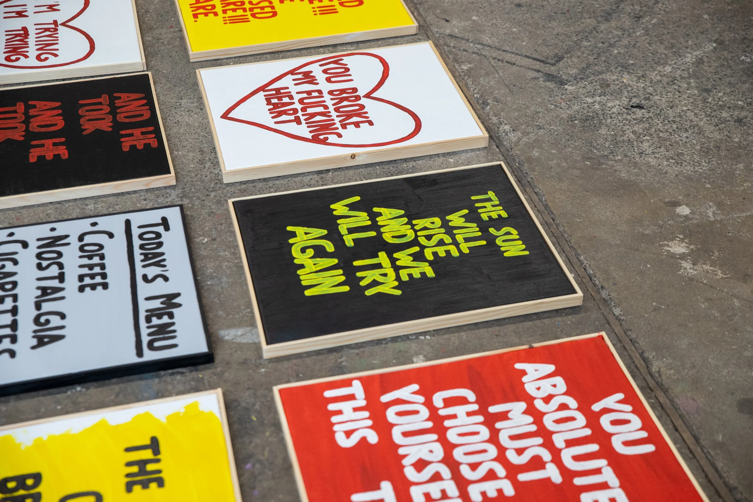 Her juxtaposition between bold colours and expressive text, punctuates her signature style.